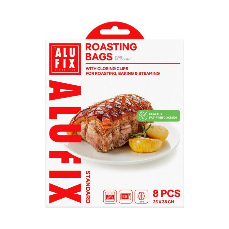 Vo vašom košíku nie sú žiadne ďalšie položky Vrecká na pečenie ALUFIX. Špeciálne vrecká na pečenie s klipsami na zatváranie. Rozmery vrecka 25x38cm. Balenie obsahuje 8ks. Výrobok je určený k použitiu v plynových a elektrických rúrach bez priameho kontaktu so zdrojom tepla.