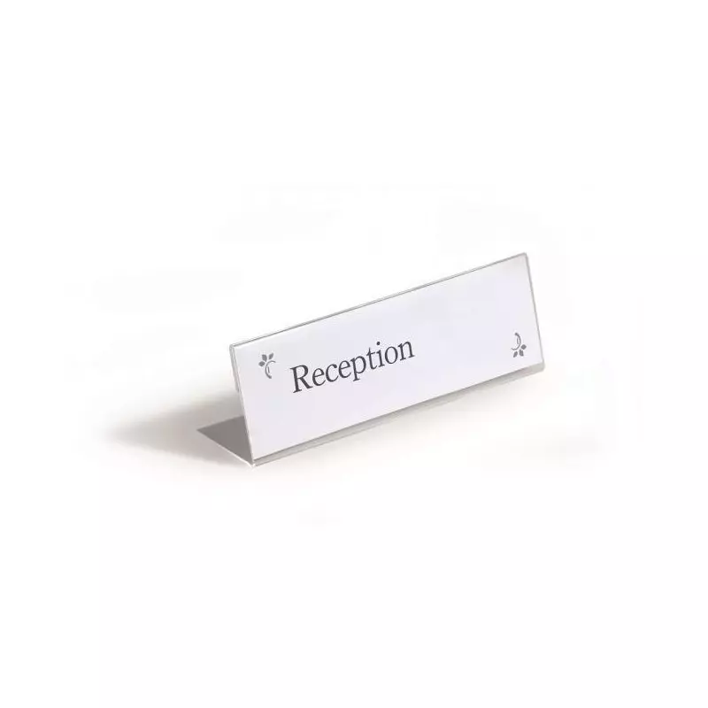 Stabilná stolová menovka „L“ profilu vyrobená z akrylu. Vhodná na konferencie, recepčné pulty, ceny tovarov a popis produktov. Väčšie balenie 10 ks.