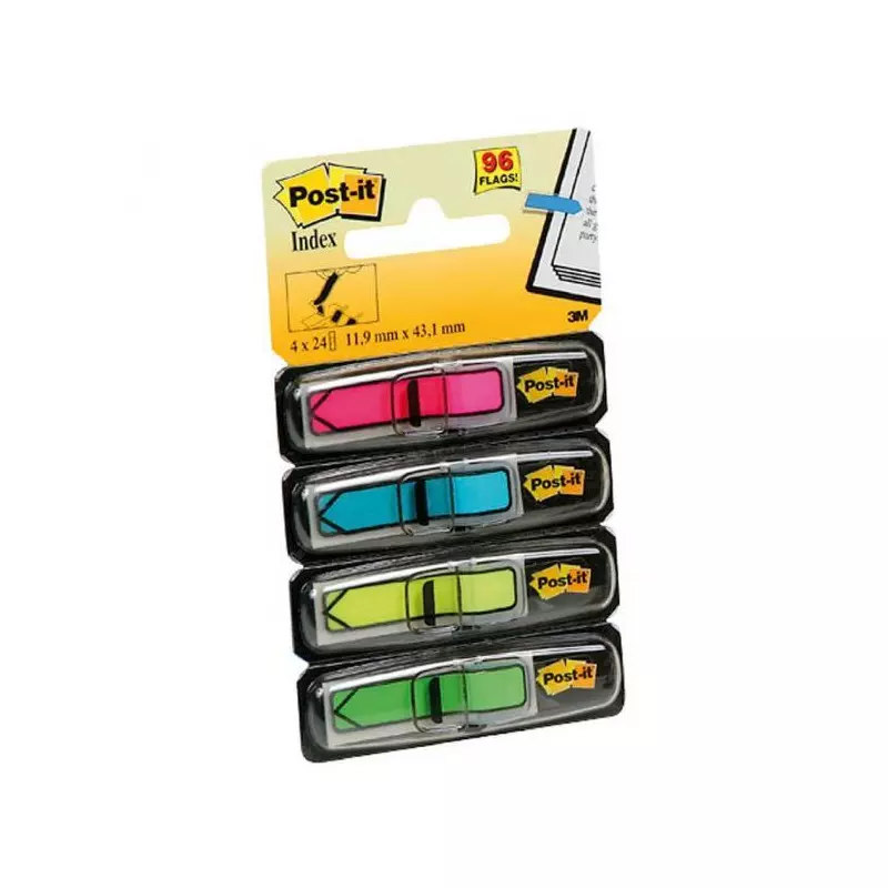 Úzke acetátové záložky do kníh, časopisov, ako register do cenníkov, kartoték, katalógov, zakladačov, archívov a pod. Priehľadná lepiaca čast a farebná časť na označenie.Prelepiteľné, znovunalepiteľné a popisovateľné. Rozmery záložky 12,5x43 mm.Dodávané v kombinácii 4 základných (červená,zelená, modrá, žltá) alebo 4 neónových farieb )žltá, fialová, ružová. modrá) po 35 lístkov.Záložky s potlačou šípky upozorňujú na konkrétnu informáciu v texte. Šírka indexu 12,5 mm, v balení 4 farby po 24 lístkov.