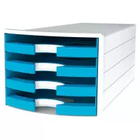 Box so štyrmi otvorenými zásuvkami v tvare počítačového monitora v trendových farbách. Rozmery (š × v × h) 294 × 235 × 368 mm. Farba svetlo modrá.